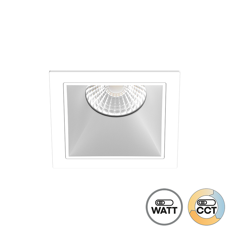 Spot décoratif, encastré, carré. Couleur d'éclairage facilement modifiable par le biais d'un switch intégré dans le driver (CCT 2700-3200-4000K). Equipé de lentille de diffusion pour un éclairage uniforme et d'un réflecteur carré blanc très basse luminance. Collerette carrée de dimensions 82x82mm en matière plastique afin de garantir la bonne tenue dans le temps dans les environnements corrosifs (ex: milieux salins). Fixation dans les plafonds suspendus à l’aide de deux ressorts. Alimentation déportée du luminaire équipée de bornier à repiquage à connection rapide. Alimentation 6/9W équipée d’un switch pour modification du flux.