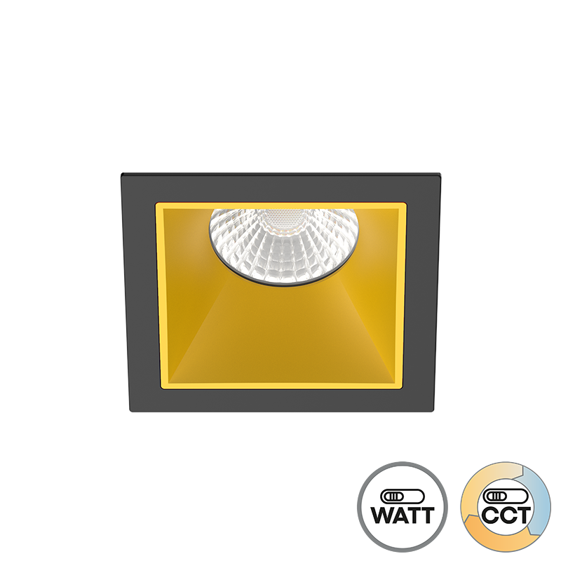 Spot décoratif, encastré, carré. Couleur d'éclairage facilement modifiable par le biais d'un switch intégré dans le driver (CCT 2700-3200-4000K). Equipé de lentille de diffusion pour un éclairage uniforme et d'un réflecteur carré doré très basse luminance. Collerette carrée de dimensions 82x82mm en matière plastique afin de garantir la bonne tenue dans le temps dans les environnements corrosifs (ex: milieux salins). Fixation dans les plafonds suspendus à l’aide de deux ressorts. Alimentation déportée du luminaire équipée de bornier à repiquage à connection rapide. Alimentation 6/9W équipée d’un switch pour modification du flux.